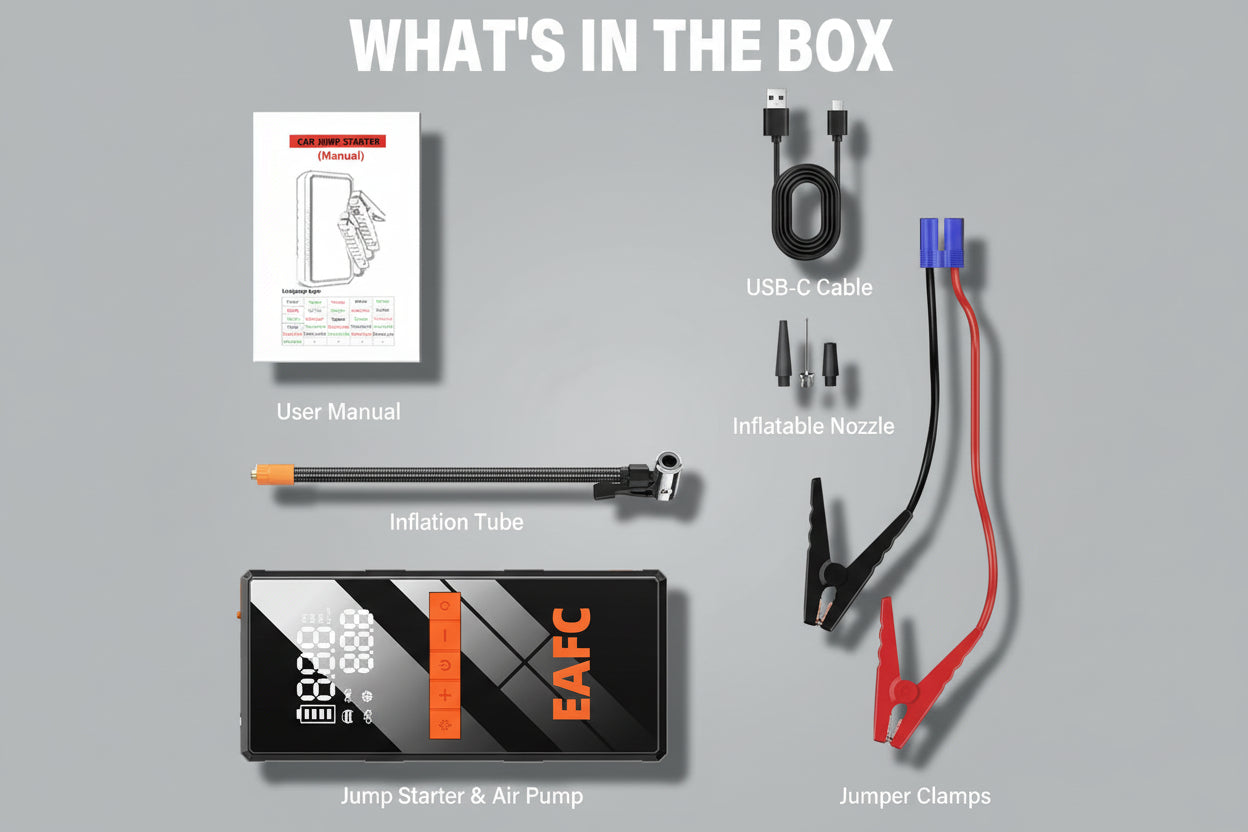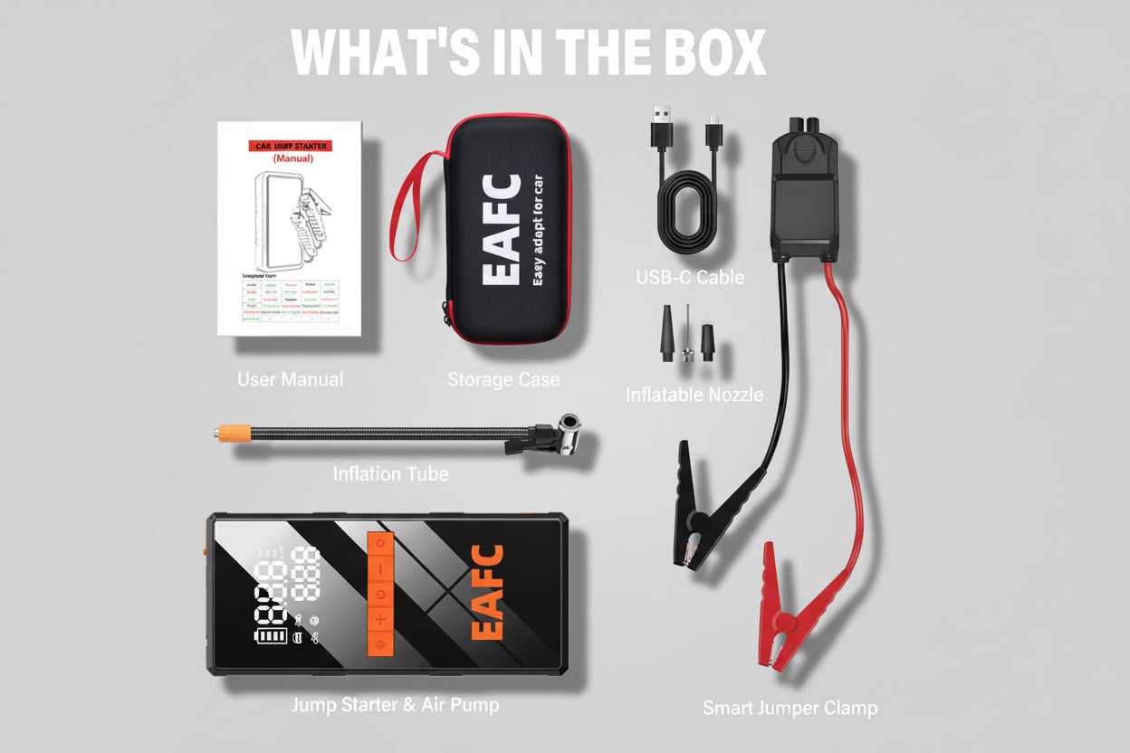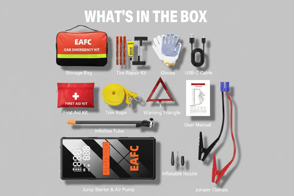 This advanced 4 in 1 air pump car battery emergency booster integrates multiple critical functions into a single, portable device. With 1200A peak jump-starting power and 150PSI air compression capability, this pump starter with air compressor addresses every car emergency with air compressor scenario you may encounter on the road.