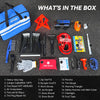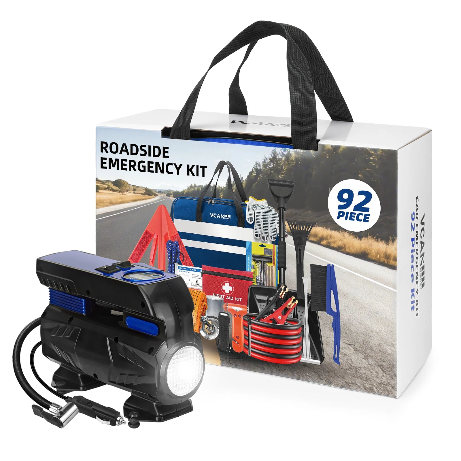 Digital Air Compressor: 12V DC powered system with automatic shut-off, pressure gauge display, three nozzle attachments, and carrying bag. Jumper Cables: 20-foot professional-grade construction with reinforced copper core and protective insulation. First Aid Kit: Sterile gauze, elastic bandages, antiseptic wipes, pain medication, tweezers, scissors, CPR face shield, and thermal emergency blanket. Weather-Resistant Carrying Case: Organized compartments with secure latches and carrying handle for convenient storage and rapid deployment.
