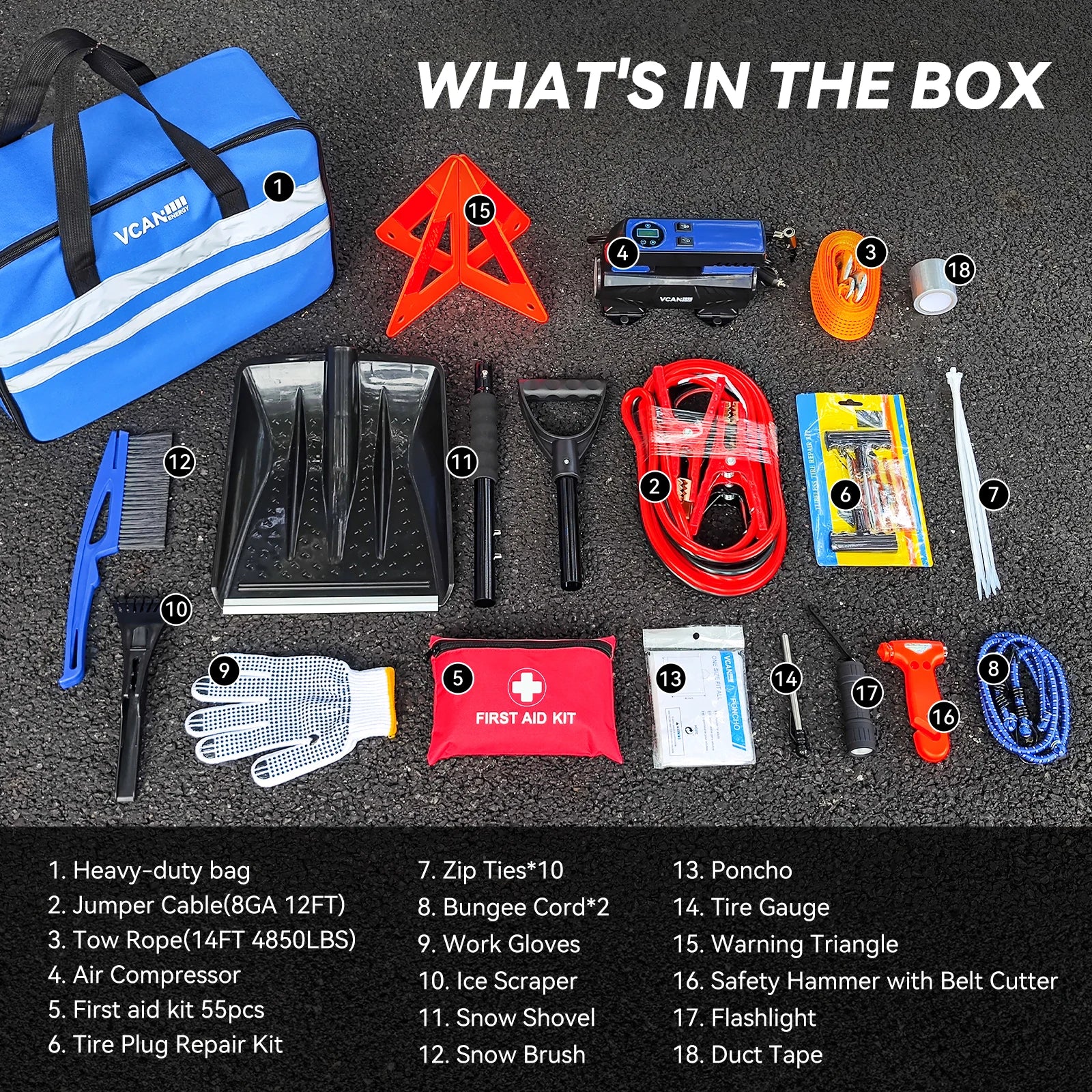 Protect yourself with our premium winter emergency car kit – essential car accessories featuring digital air compressor, jumper cables, and first aid supplies for ultimate cold weather emergency car kit protection and winter travel security.