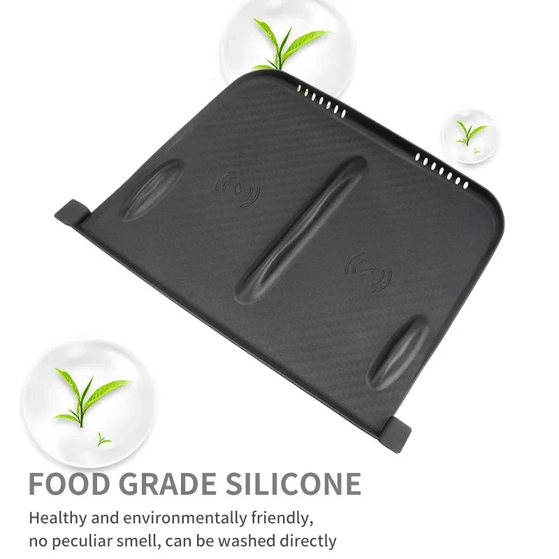 This premium wireless charging pad for car console for Tesla combines elegant aesthetics with practical functionality. The carbon fibre finish complements your vehicle's interior while the non-slip silicone mat ensures your devices remain secure during acceleration and braking.