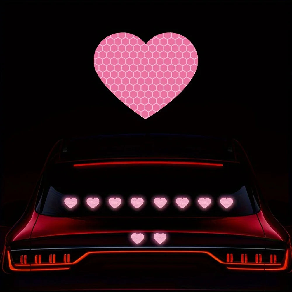 This comprehensive set includes 10 pieces of heart shaped reflective stickers designed to enhance both safety and aesthetics. Each pink reflective sticker features waterproof vinyl construction, ensuring durability against harsh weather conditions, UV exposure, and constant road vibrations. The reflective coating activates during nighttime and low-light conditions, providing critical visibility for other drivers while adding a charming decorative touch to your vehicle.