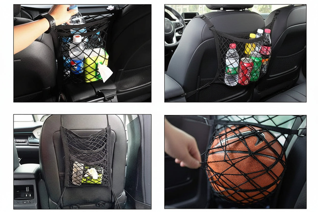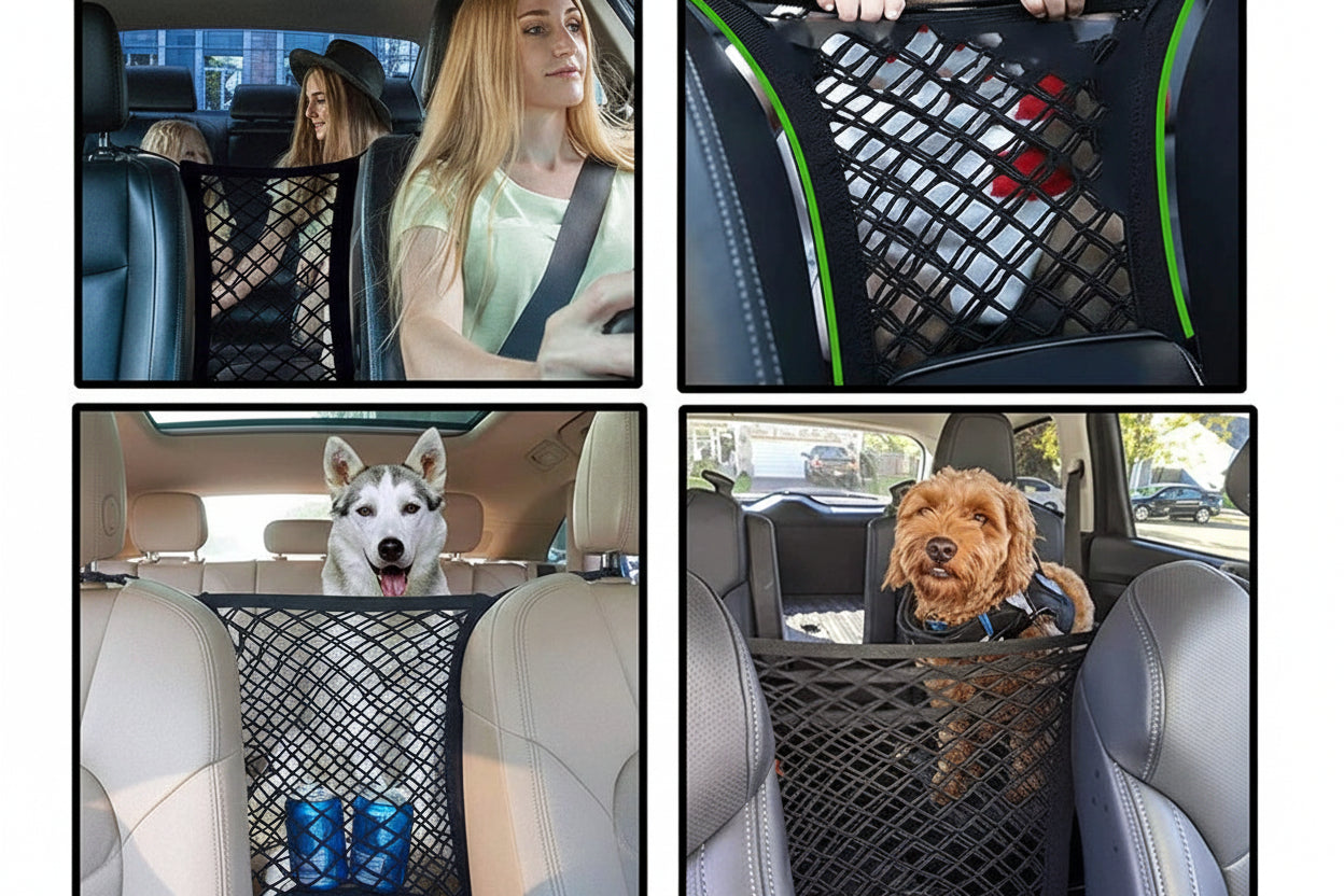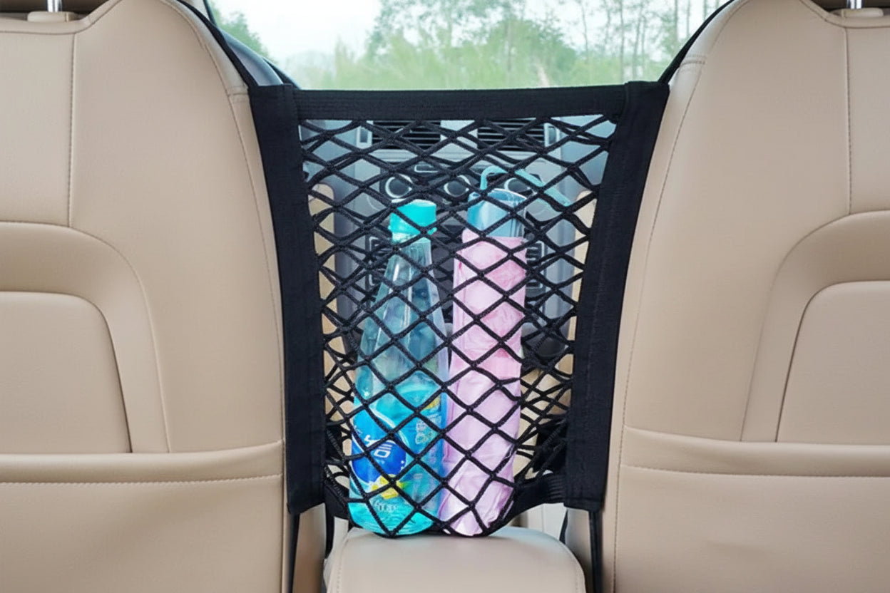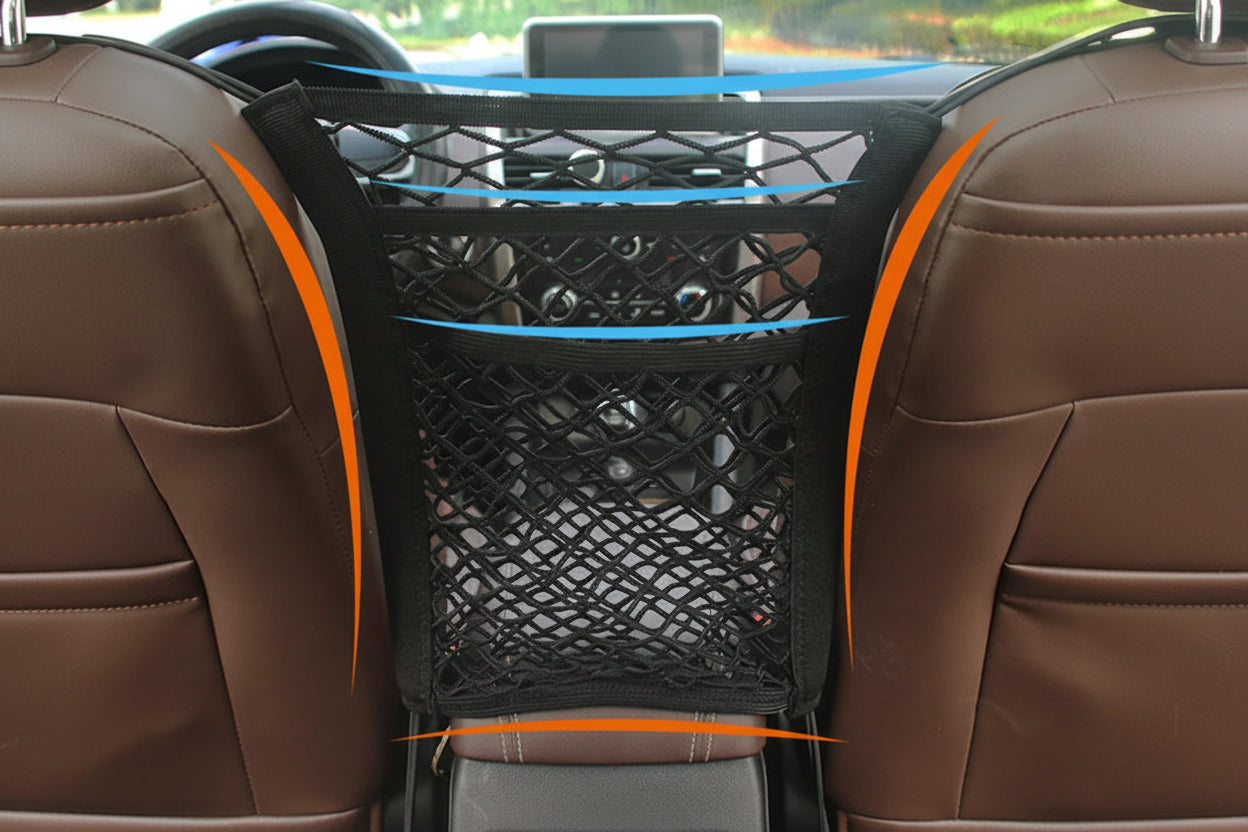 Maximize Your Vehicle Space with Our Car Seat Divider Storage Solution – The Ultimate Car Accessories for Organized Driving. This stretchable elastic mesh bag keeps passengers and pets safely separated while providing convenient storage between seats for your essentials.